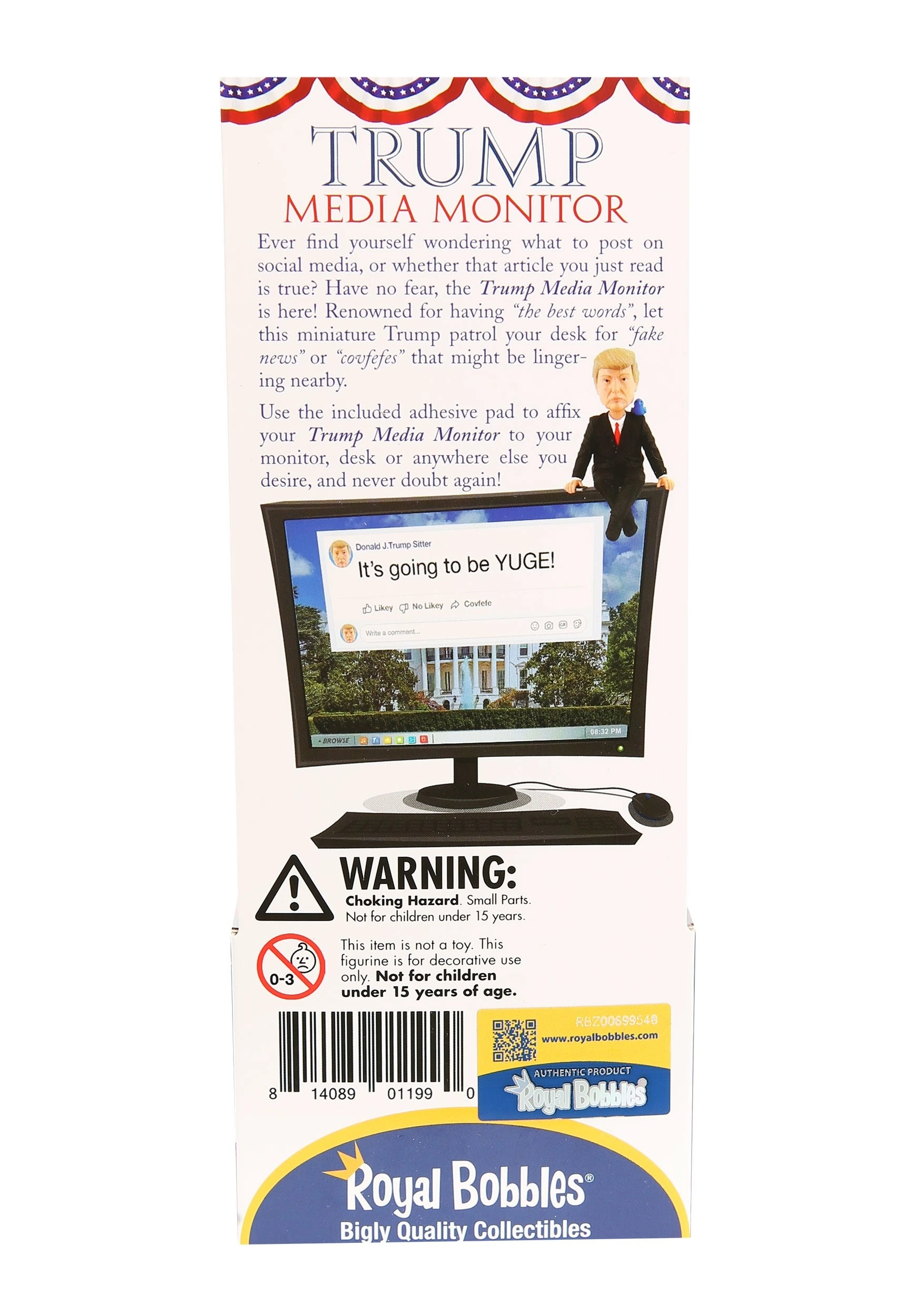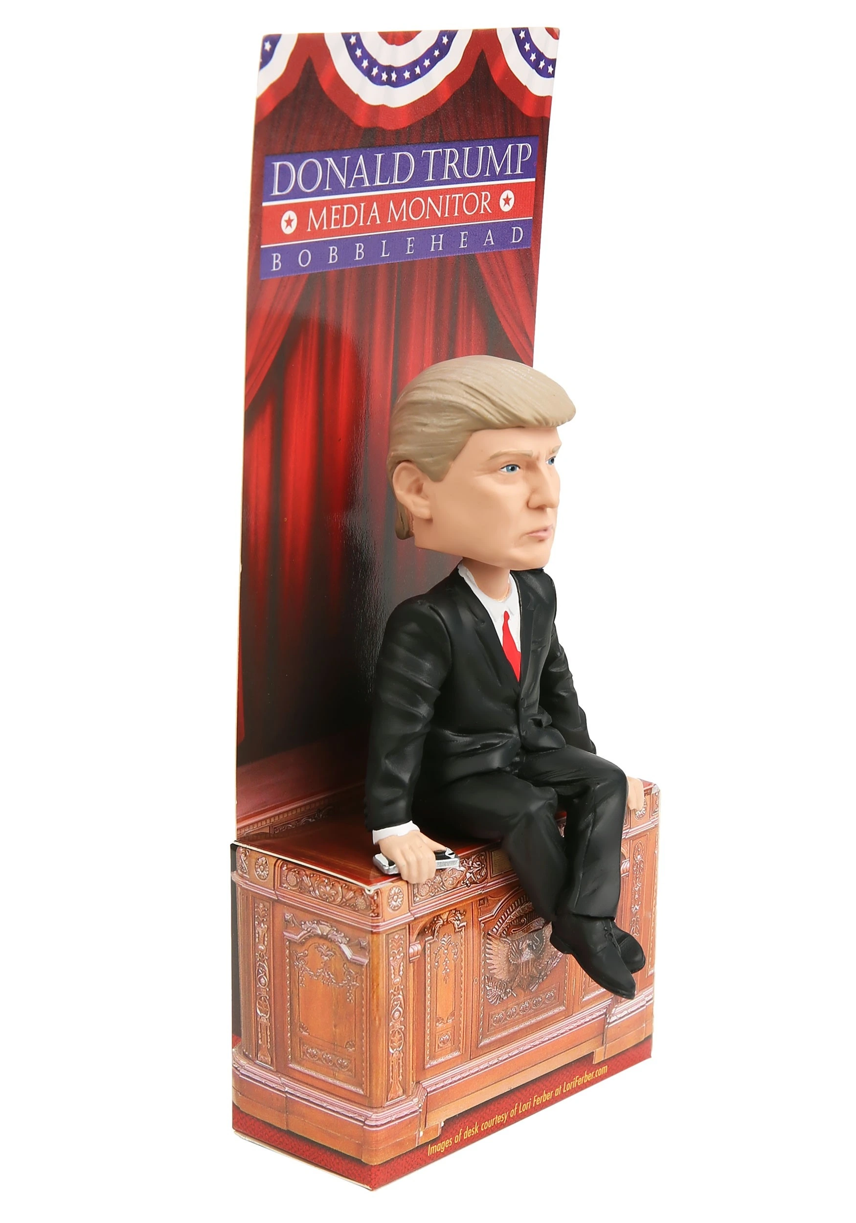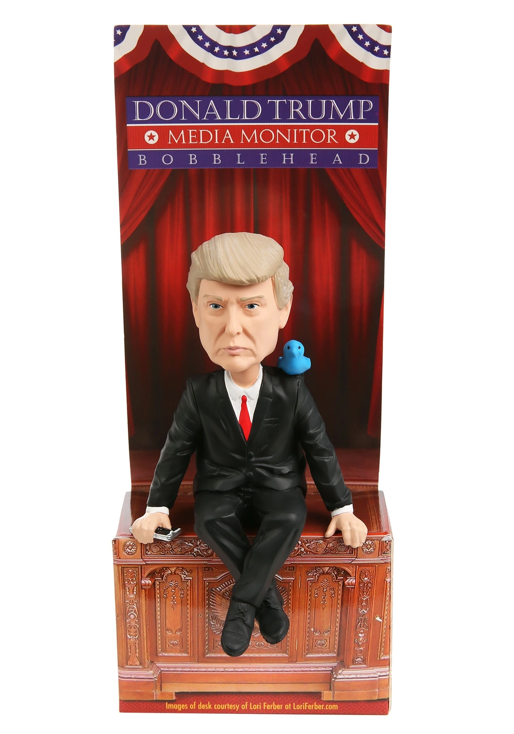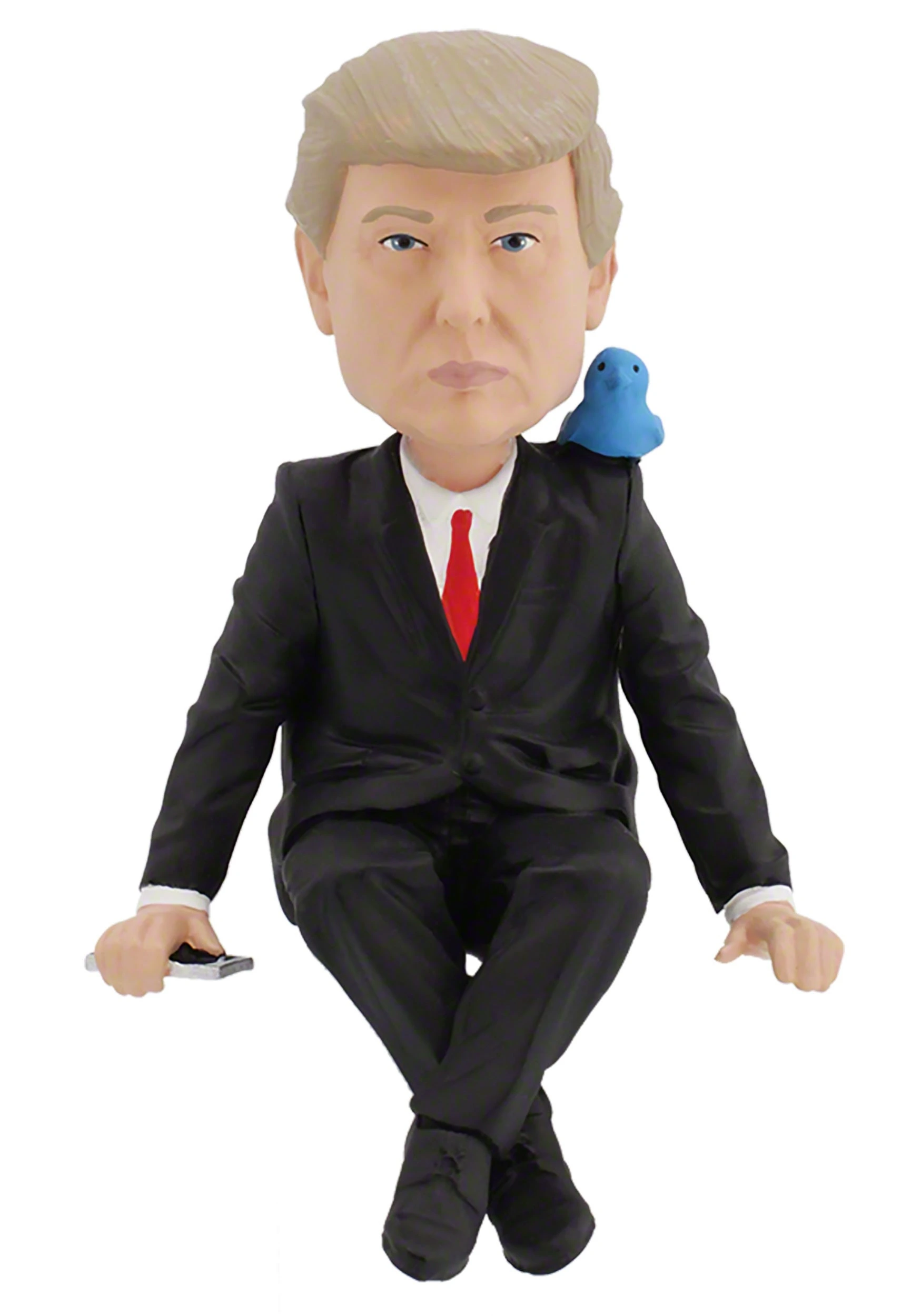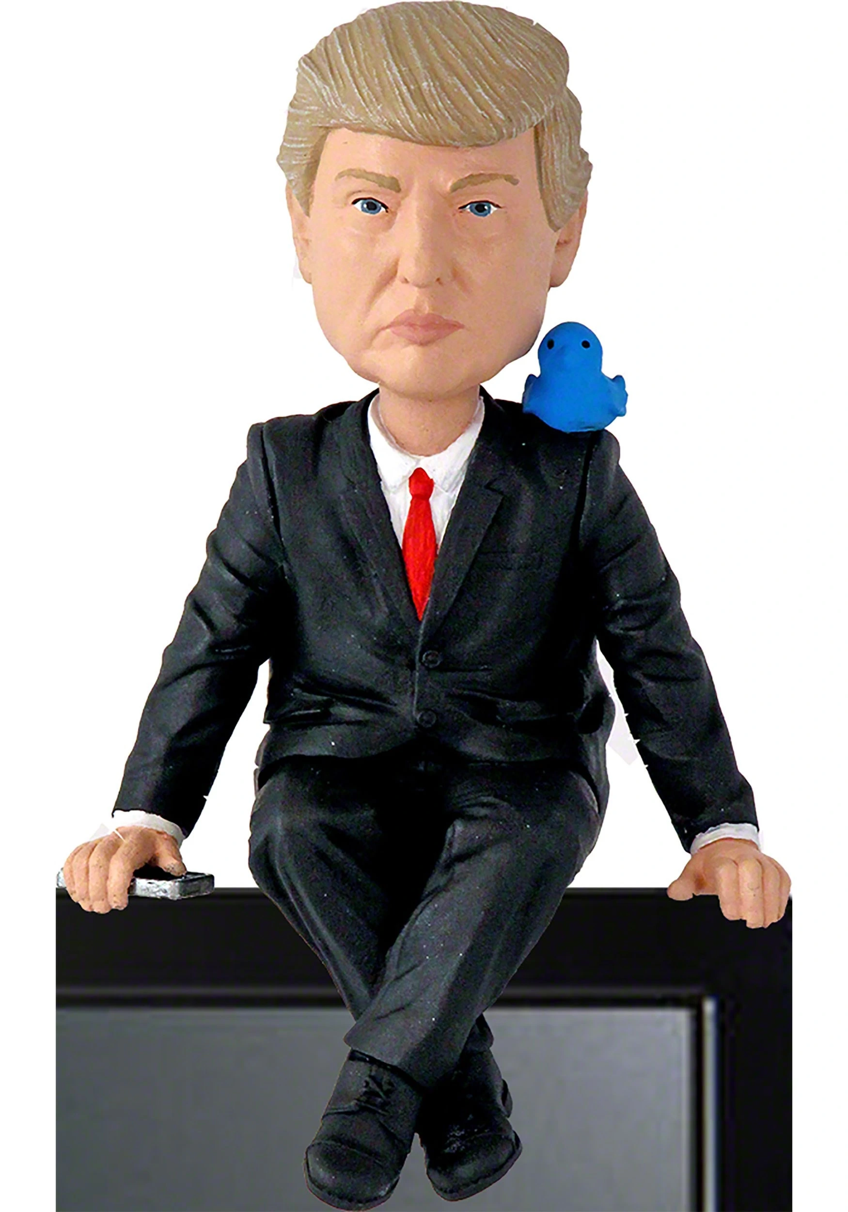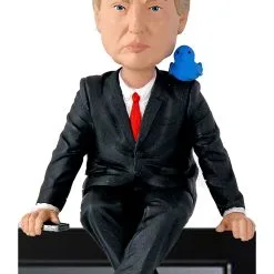 This Donald Trump Media Monitor is a bobblehead that fits right on the top of your monitor, or any other place with a 90 degree edge. From Royal Bobbles, this figure is made of resin and is about 4″ tall in a seated position. The figure features classic spring-powered bobblehead action, and even features a little blue bird perched on its shoulder!