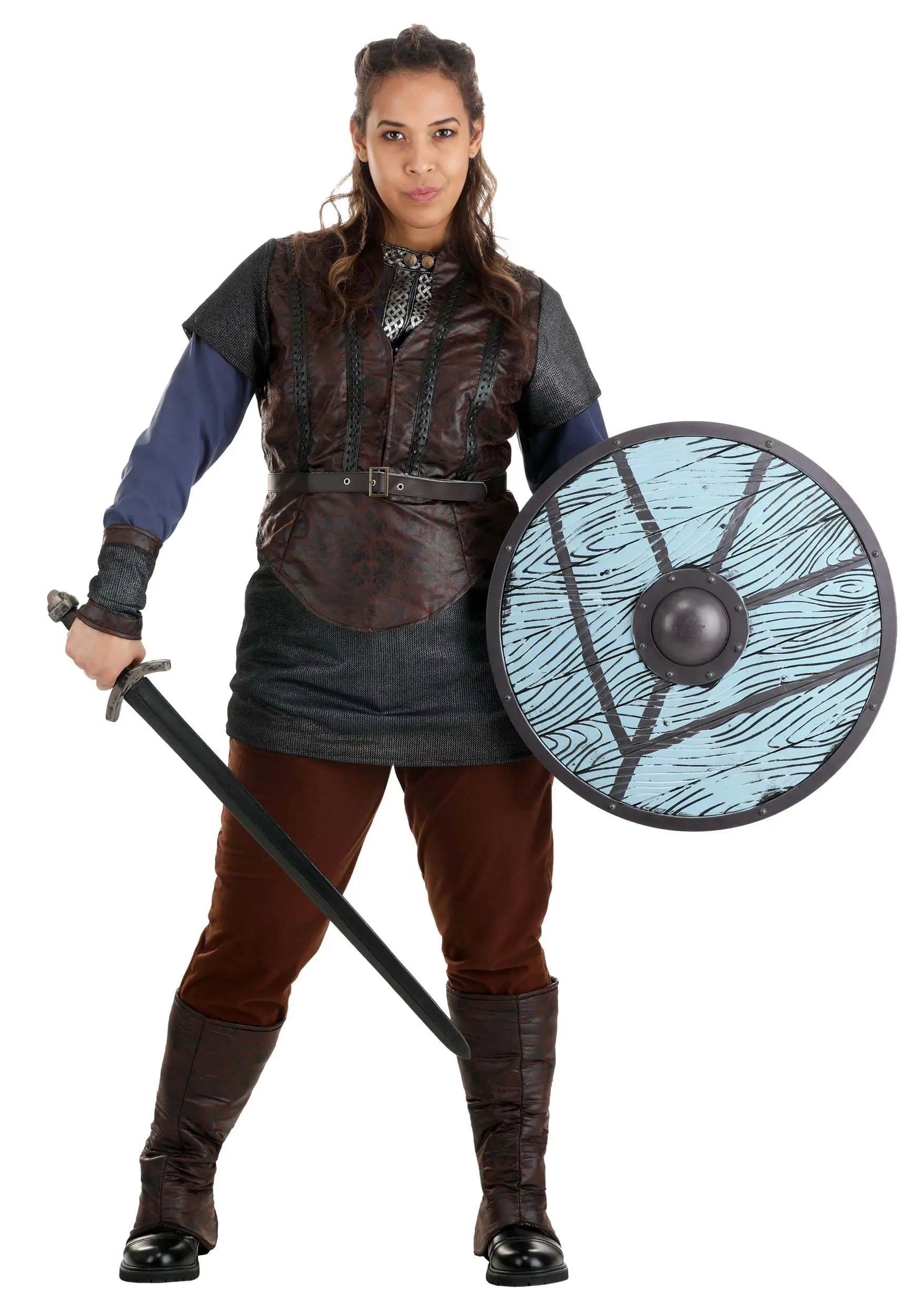 It was sure a daunting task to bring Lagertha Lothbrok to life but our in-house design team was proud to answer the call! Get ready to feel like the Shieldmaiden that stole our hearts with this officially licensed Lagertha costume from Vikings. This is a complete ensemble designed to faithfully replicate the Shieldmaiden’s look from the History Channel show. It includes an embroidered shirt under a tunic detailed with faux chainmail and leathery looks. The pants and boot covers keep you in style while the lace-up gauntlets match the chainmail of the tunic. Wield one of our Vikings shields or weapons to make sure you are victorious.
