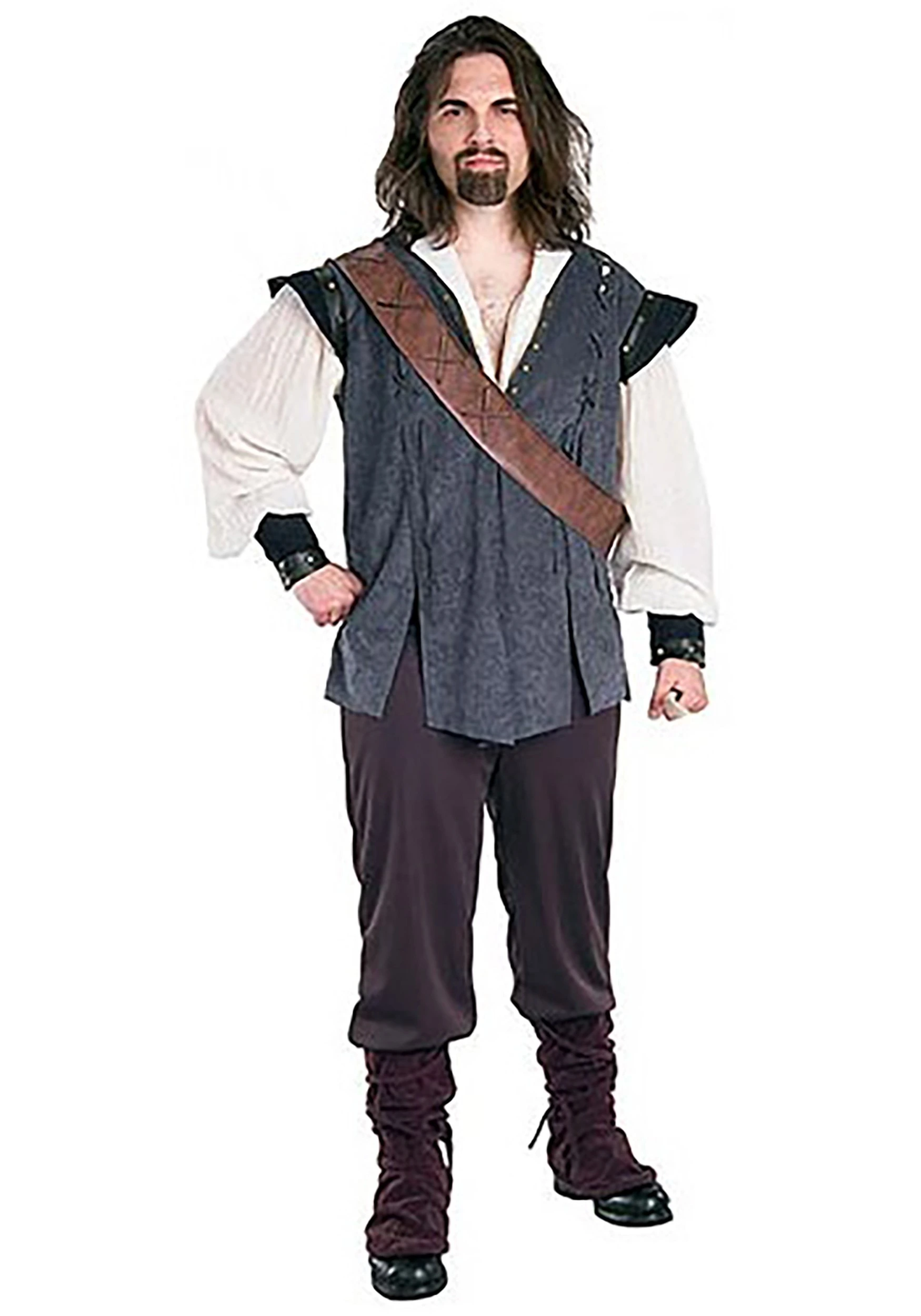 Hawk your wares and exchange them for gold coins in this Renaissance Merchant Adult Costume! The gray velour tunic is made of the finest polyester and is sewn with cream gauze sleeves that will show your customers that you’re a man of means. Black velour cuffs and shoulder pads proclaim you to be more than just a common peddler. A black faux leather sash crosses your chest, and is excellent for hanging your money pouch. The charcoal-colored pants tuck nicely into the velour boot tops. Be careful when crossing the thoroughfare – Renaissance streets aren’t to clean, and the boot tops are too nice to get mucky!