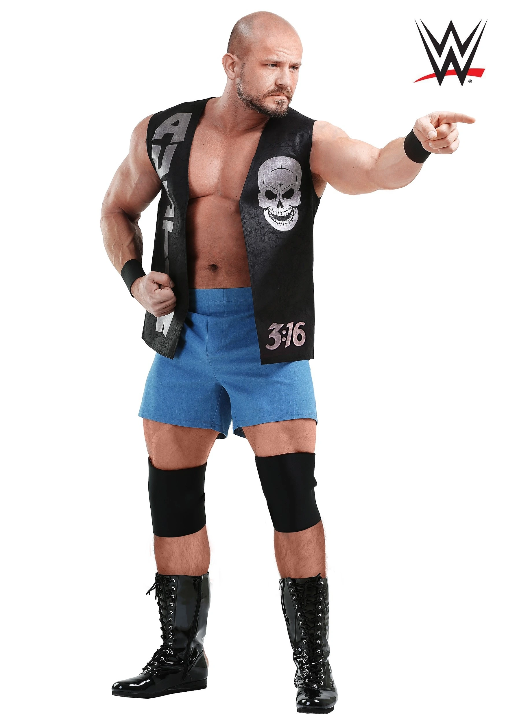 This Stone Cold Steve Austin costume is an officially licensed WWE look that comes with everything you need to look like the legendary Steve Austin! It comes with a black vest that has a skull emblem printed on the front, along with “Austin 3:16.” It even comes with knee pads and wristbands to finish the look. All you need to do is start working on your ring-presence and maybe start growing a sweet goatee.