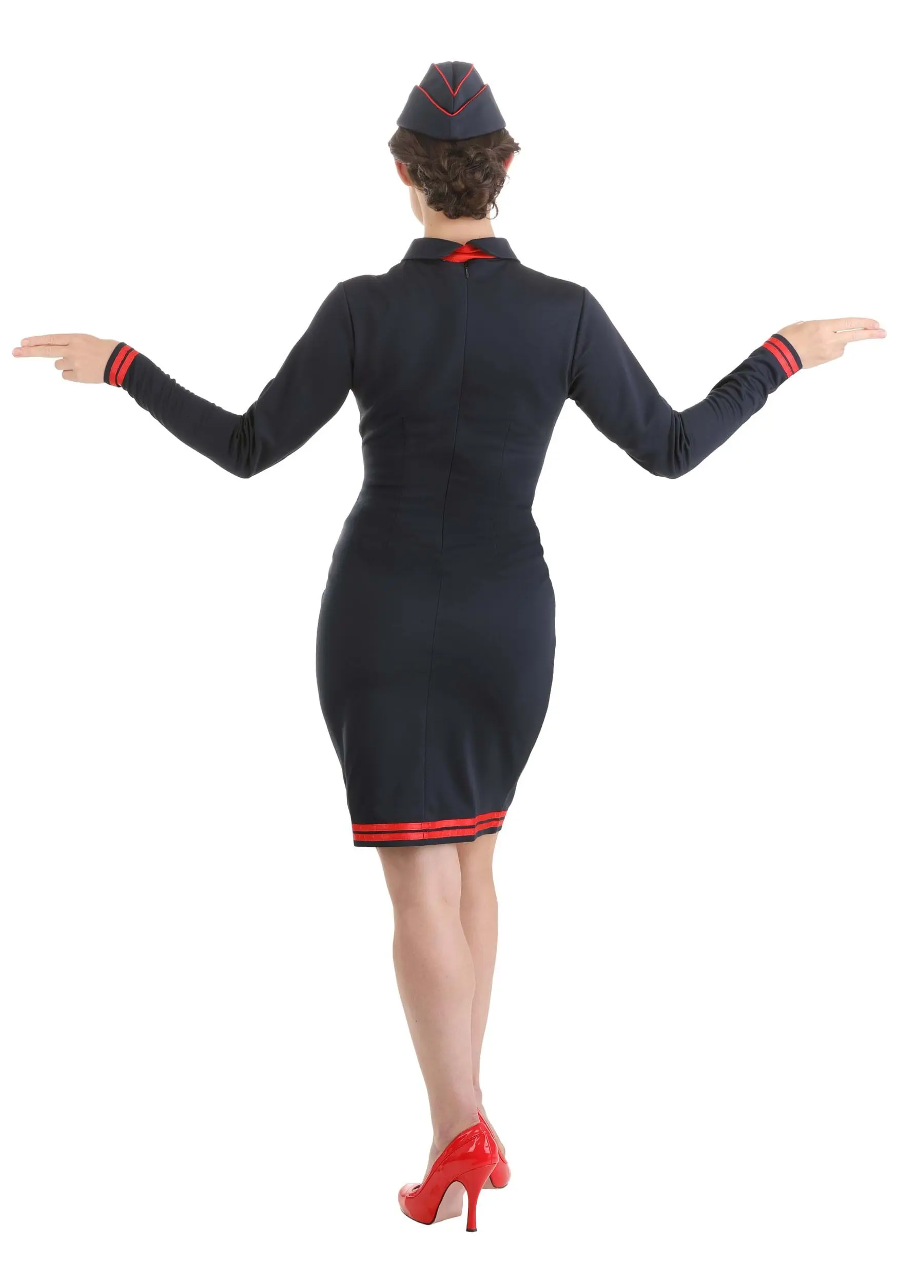 Turn the airplane aisle into your own personal runway when you wear this exclusive Working the Skies Flight Attendant Costume! The navy polyester dress fits like a glove and ends at mid-thigh for a sassy silhouette. The hemline and cuffs are embellished with red piping trim that’s both demure and devilishly cute. The red satin scarf ties around your neck and flutters in the cabin air conditioning, while the fully-lined cap is trimmed with more matching piping.
